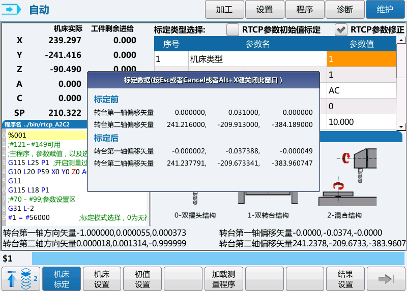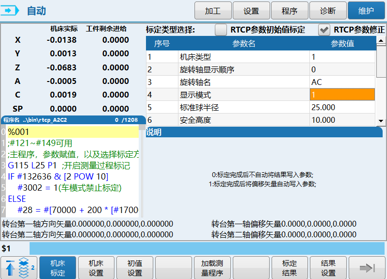 1. Machine Tool Settings: In the system interface, select the type of machine tool calibration, the 5-axis structure type, and the names of the rotary axes. For example, for the most common 5-axis structure, the AC cradle dual rotary table, set the calibration machine tool type to 1, the rotary axis display order to 0, and the rotary axis name to AC, ensuring that the rotary axis is listed first.